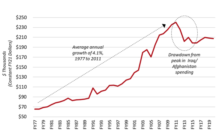 The size of U.S. military forces tends to be a major driver of O&M costs. Whether measured in “end strength” (uniformed personnel) or in force structure (number of operational units), bigger is more expensive. Indeed, even a force that does not change in size over time will tend to consume more and more O&M funding as inflation affects the vast array of goods and services required to sustain it. Since the late 1970s, the O&M cost per active servicemember has increased at a relentless pace (see figure 3).