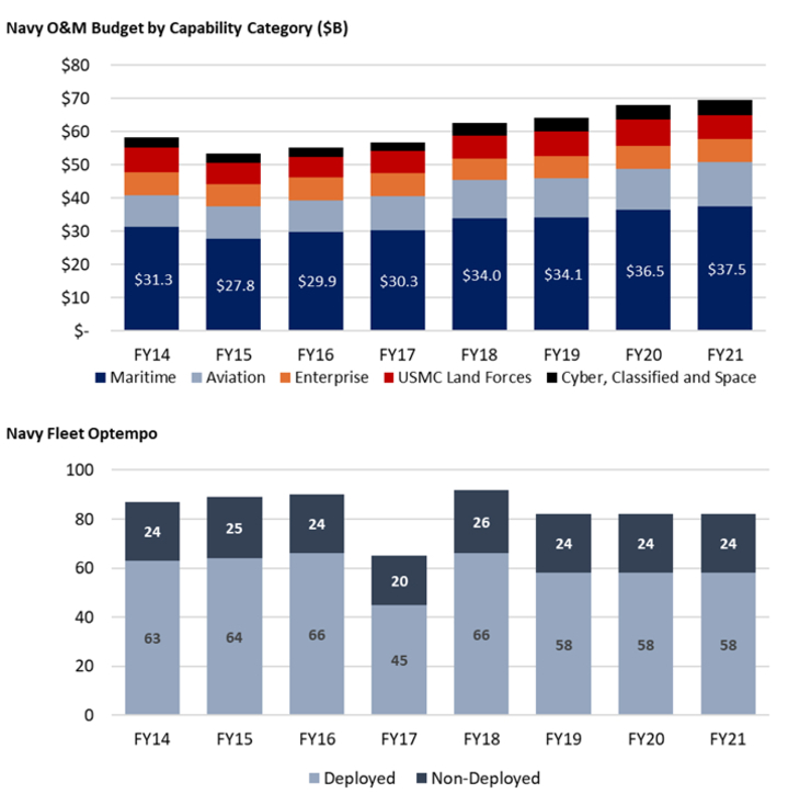 Source: Operations & Maintenance figures from Avascent analysis of Defense Department O-1 documents. Operational tempo figures are from Defense Department FY2021 operations & maintenance overview. Operational tempo figures measure the number of days per quarter ships were underway on their own power. Operational tempo figures shown here are for the active U.S. Navy only. Operations & maintenance budget counts total Navy.