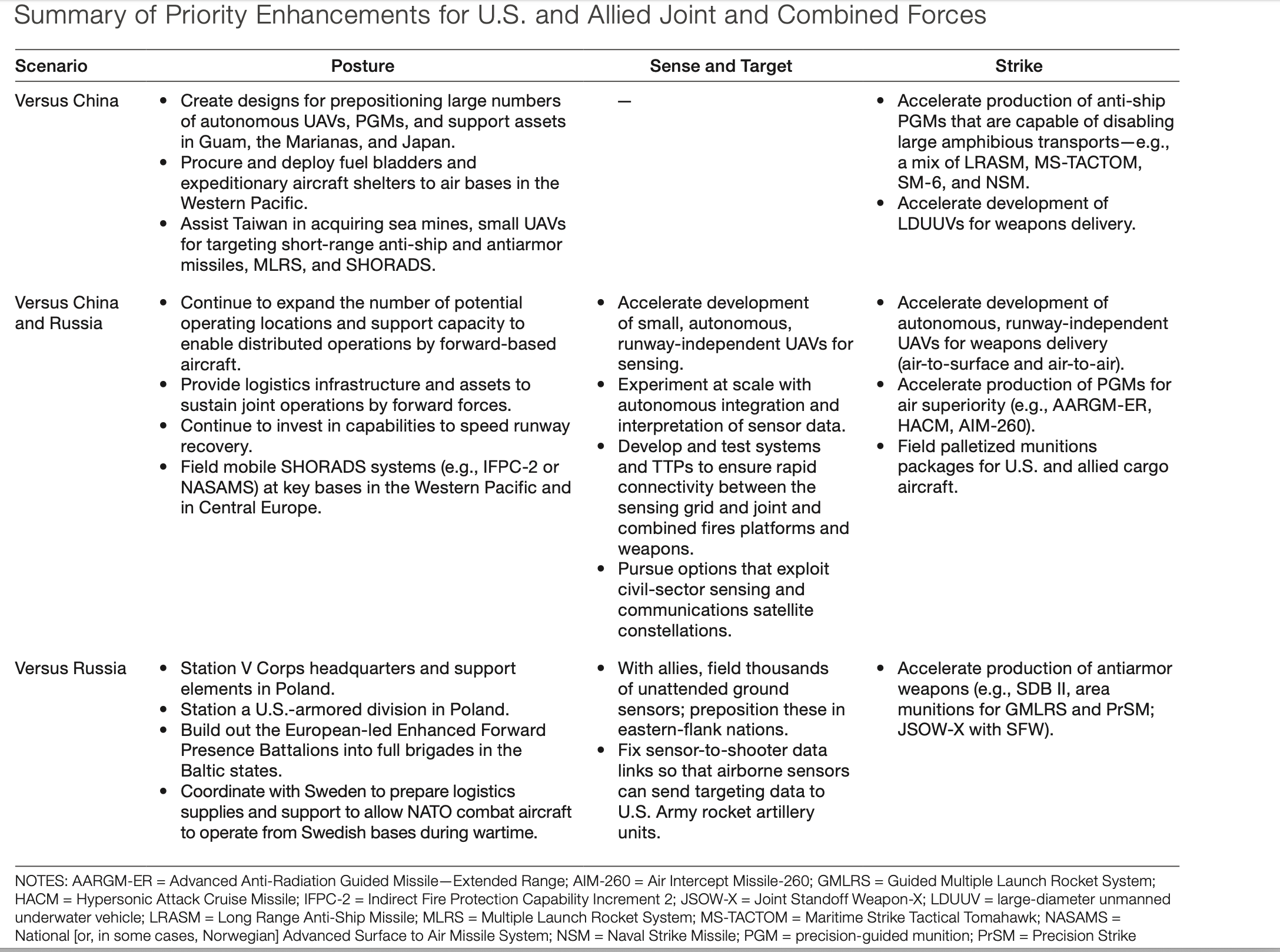 The table below summarizes the sorts of capabilities that wargaming and associated analysis show are called for in order to enable the new approach to power projection described here.