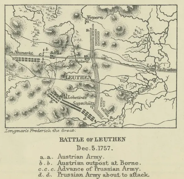In early December 1757, it appeared as though, at least in continental Europe, Prussia and its allies had lost what would come to be called the Seven Years’ War (1756-1763). A series of hammer blows, delivered in late summer by the French and Austrian enemies of the Prussian King Frederick II, “the Great,” threatened to end the war. Frederick had suffered his first serious defeat at Kolin in June, and his Anglo-Hanoverian allies suffered catastrophe in the aftermath of the Battle of Hastenbeck in July. While Frederick had turned to confront the French, his Austrian enemies had established a base on his territory by taking the fortress of Schweidnitz and smashing the Prussian field army in Silesia at Breslau in November.