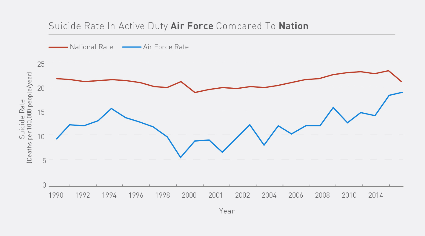 Note on data: The date used in this article were compiled by the authors using Annual Reports of the Department of Defense Suicide Prevention Office, Centers for Disease Control Web-Based Injury Statistics & Reporting Query System, and academic research. Data on the reserve component is available only from 2010 to present. The annual number of suicides in the Air Force Reserve, Air National Guard, Navy Reserve, and Marine Corps Reserve are, in each, so few and unpredictable that calculating a rate is avoided here. National data is adjusted for ages 17-60 and reflects a male/female ratio of 85:15, roughly that of the U.S. military. Special thanks to We Are Flint for chart design.