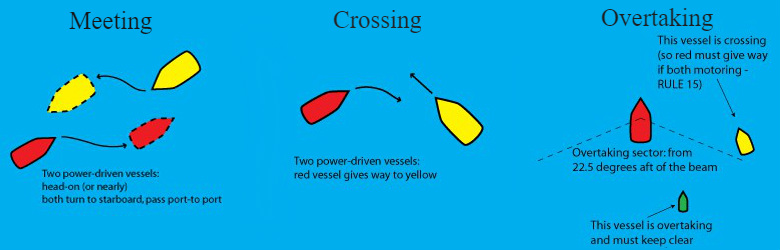 These are the typical ways power-driven vessels encounter each other. From left to right: Meeting (or head-on), crossing, and overtaking. (Adapted from Aztec Sailing).