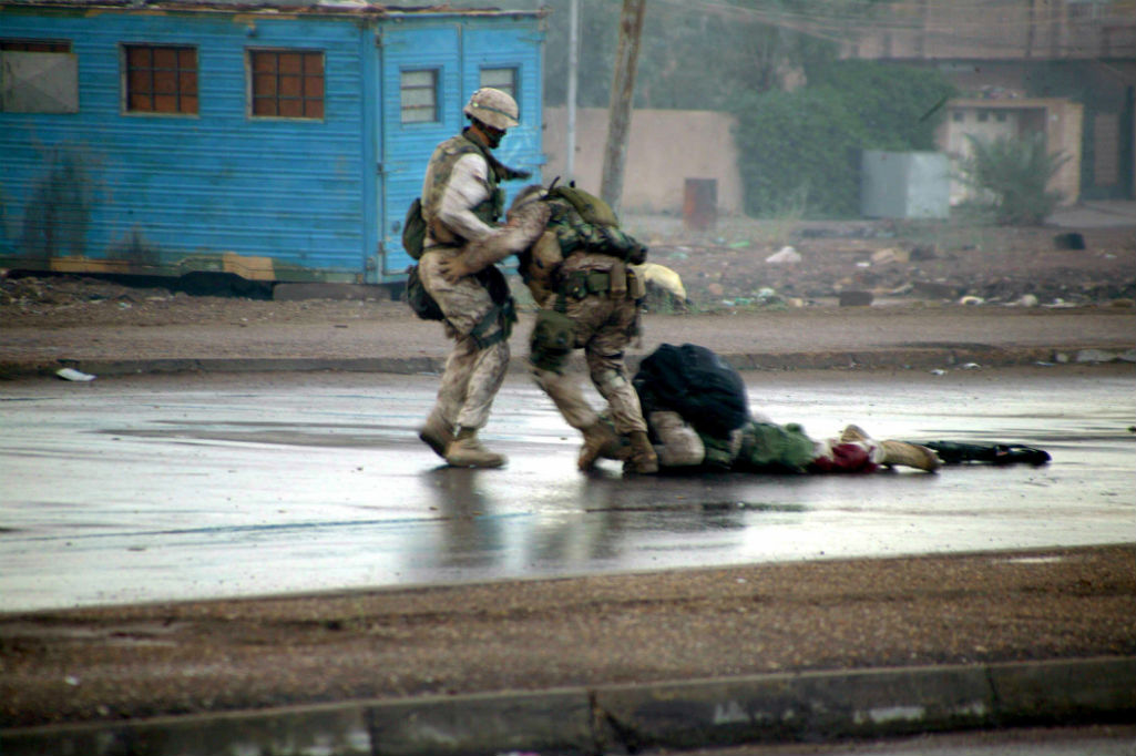 Fallujah, Iraq (Nov. 9, 2004) – Gunnery Sgt. Ryan P. Shane (center), platoon Gunnery Sergeant assigned to Company B, 1st Battalion 8th Marine Regiment (1/8), Regimental Combat Team 7, and another member of 1/8, recover a fatally wounded Marine while under fire during Operation Al Fajr. Seconds later, Shane was wounded by enemy fire (U.S. Marine Corps photo by Cpl. Joel A. Chaverri).