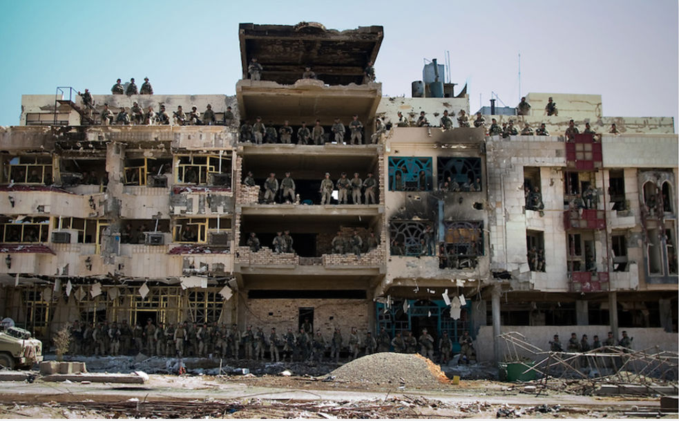 August, 2004: Charlie Company, Battalion Landing Team 1/4 at the conclusion of the Battle of Najaf. The Marines battled for multiple days to seize and then hold these three inter-connected hotels overlooking the Imam Ali Mosque (Photo by Lucian Read, used with permission).