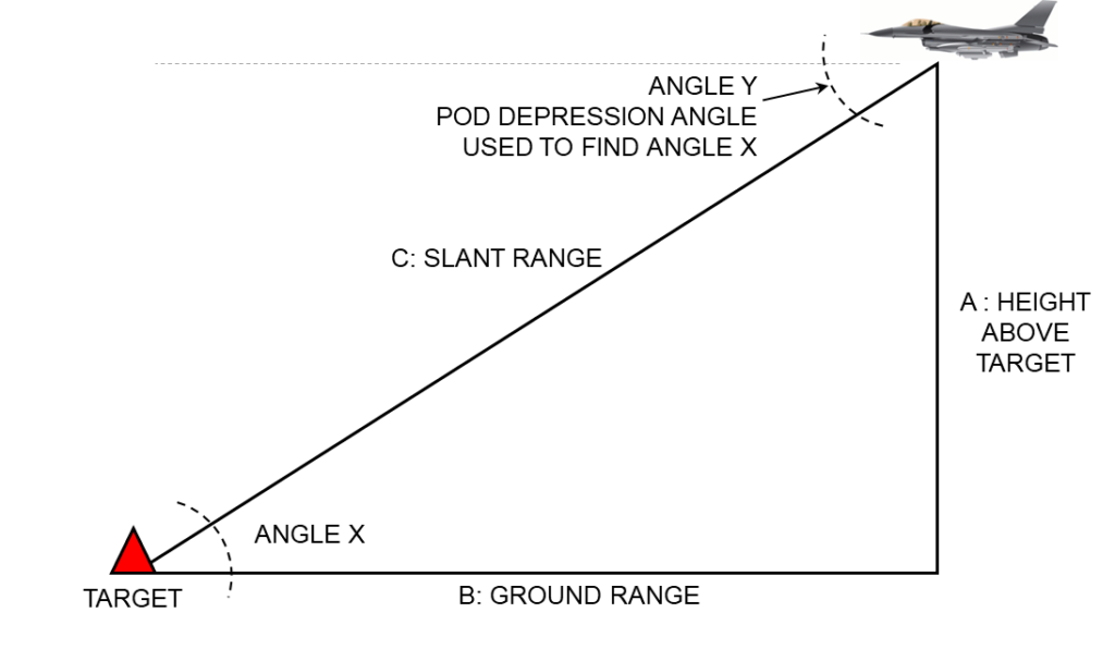 Let’s assume the pilot is airborne and told to strike a particular target. To generate coordinates for the bomb, the pilot must ensure that he has the target in sight using a coordinate-generating sensor and that the internal navigation unit is within acceptable alignment criteria. Calculations similar to the old-school bombing triangle are required, but they must be much more precise. Firing the jet’s laser at the target provides the slant range (side C) and angle Y, while the jet’s computer provides a system altitude (side A) and uses trigonometry to complete the rest of the triangle — specifically, angle X and side B (see Figure 2). This side is the exact ground range from the jet to the target.
