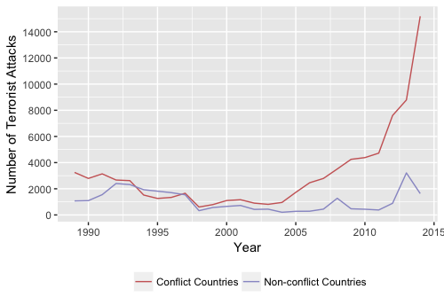A sizable and widening gap between the two curves emerges around 2004, with attacks in countries experiencing conflict starting to far outpace attacks in non-conflict countries. This coincides with expanding wars in Iraq and Afghanistan – and after 2011, turmoil related to the Arab Spring. However, perhaps counterintuitively, the graphic also indicates that for a period in the mid-1990s, terrorist attacks in countries not experiencing civil wars exceeded attacks in war-torn states. Moreover, in some years, the attacks outside of warzones numbered several thousand.