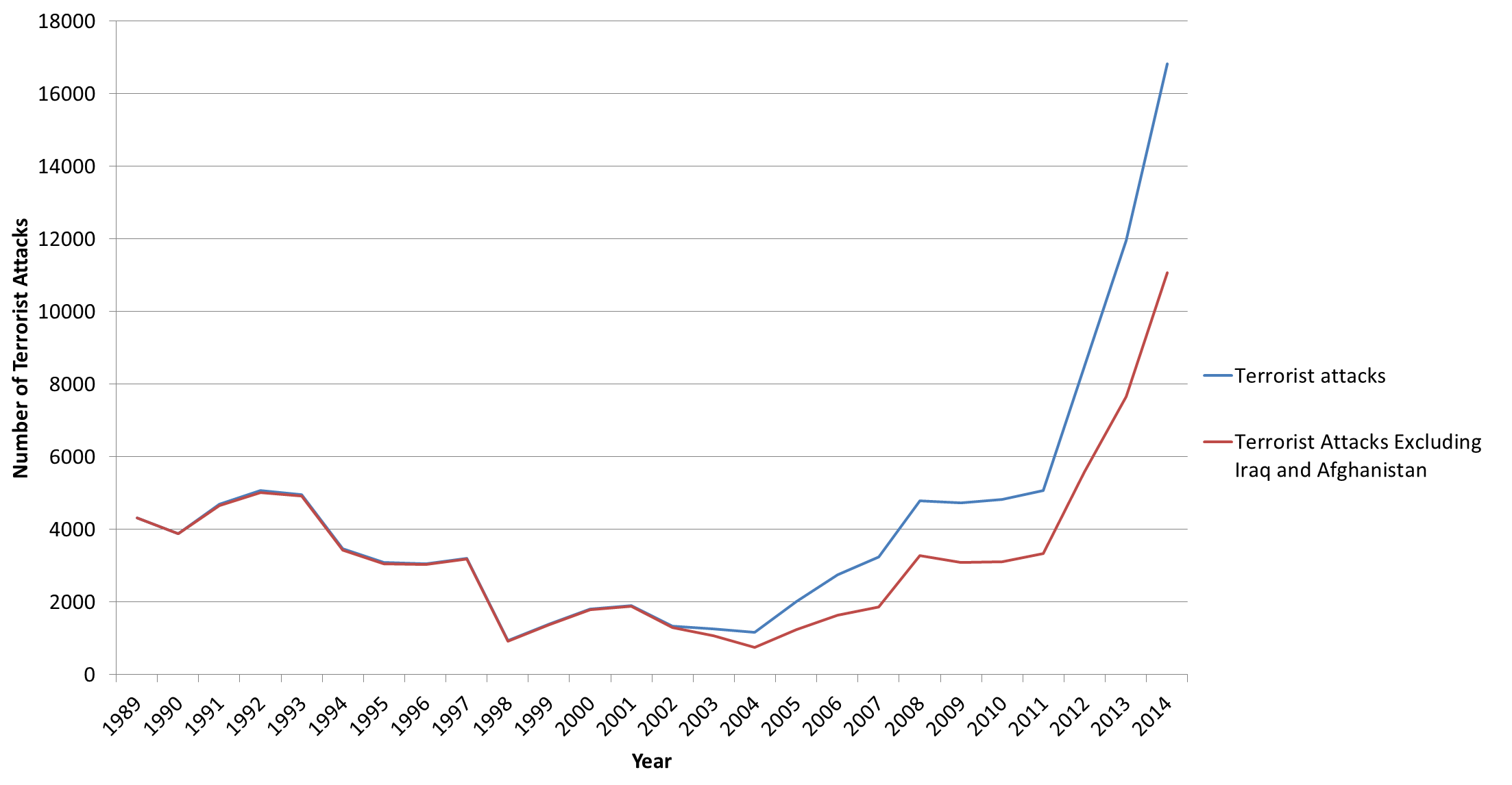Figure 1 displays the number of terrorist attacks worldwide in the Global Terrorism Database each year from 1989 to 2014. The graphic indicates that global terrorist attacks rose dramatically after 2004: There were just over 1,000 in 2004, but almost 17,000 in 2014. The numbers from 2015 and 2016 (not shown) have remained remarkably high, but below the 2014 peak. The upward pattern holds even when removing attacks in Iraq and Afghanistan.