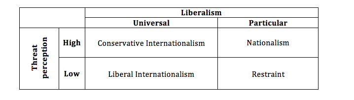 I suggest we map the terrain by asking two foundational questions. The first and most important concerns the ontological status of liberalism and America’s role in the world. Is liberalism universal and America its champion? Or is liberalism just another tribal practice, in whose spread America has no particular interest? Second, how dangerous is the world? The answers to these questions correlates with one’s belief about the costs of foreign policy initiatives, beliefs about the relative utility of hard versus soft power, and beliefs about the viability of cooperation. At one end of the spectrum are those who think the world is very dangerous, action is difficult, military power is more dependable than civilian, and cooperation is rare. At the other are those who think otherwise. These two axes yield four grand strategic options.
