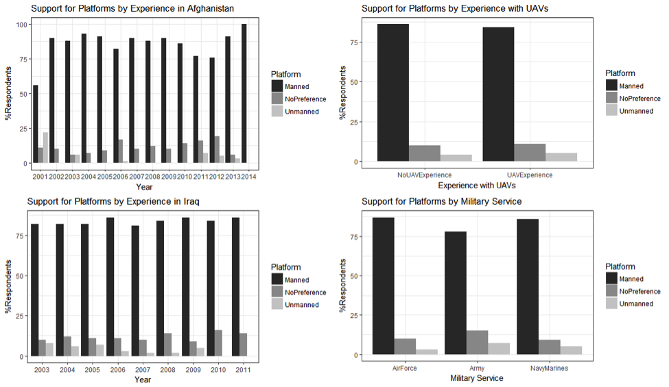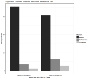 As Askonas and Howard alluded to in their piece, there are some specialties within this sample — in particular special operations combat controllers — who have the most experience with unmanned aircraft. We did not ask our respondents to identify themselves as part of special operations units because we were conscious of security concerns within this community. However, we did ask respondents, “in general what percentage of your controls have been with manned aircraft and what percentage with unmanned aircraft?” This allows us to see if those with more unmanned controls by percentage would be more likely to prefer unmanned systems. The average respondent reported only 20 percent of their controls were with unmanned aircraft. We therefore parsed out those respondents that had an above-average percentage of unmanned controls. Would that translate to a greater preference for unmanned aircraft? We did not find a statistically significant difference between the two populations (the p-value for our t-test was .308), but we did find a small increase in preference for unmanned aircraft in our more experienced group. This suggests that, while not yet significant, more controls experience could increase trust for unmanned systems.
