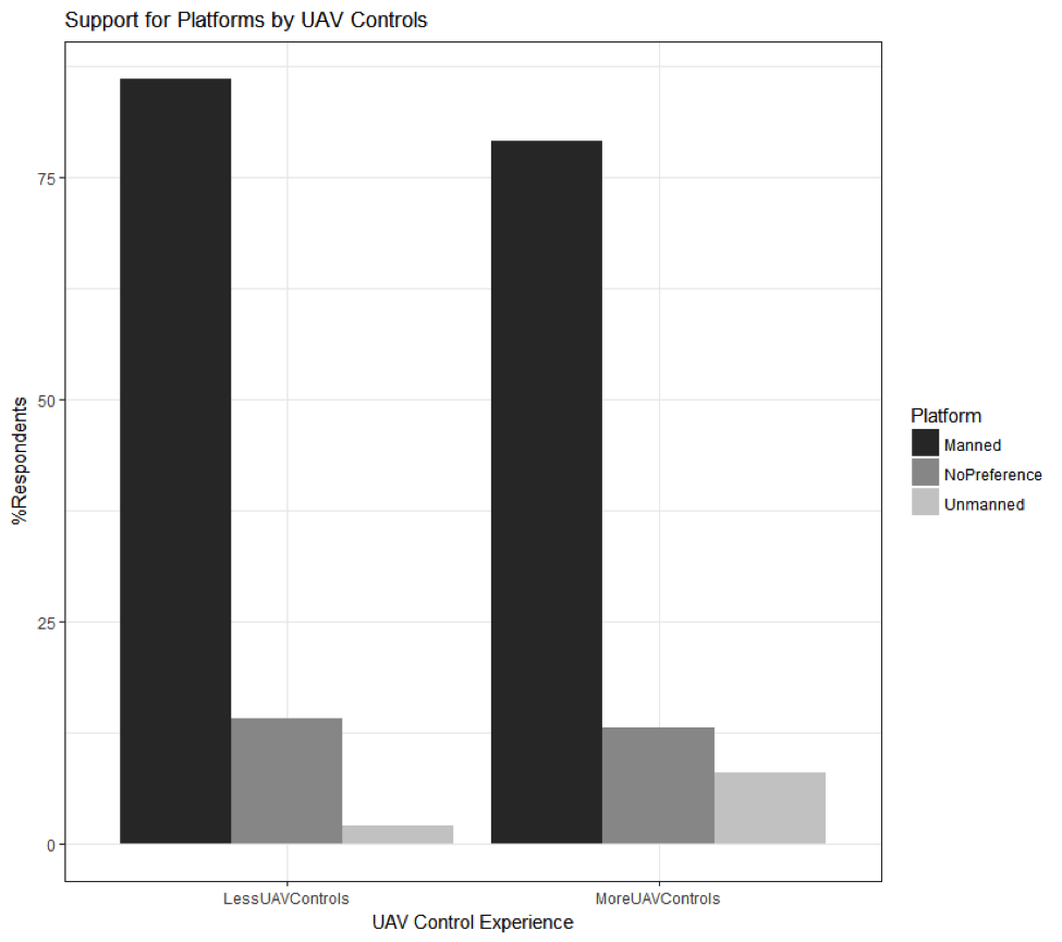As Askonas and Howard alluded to in their piece, there are some specialties within this sample — in particular special operations combat controllers — who have the most experience with unmanned aircraft. We did not ask our respondents to identify themselves as part of special operations units because we were conscious of security concerns within this community. However, we did ask respondents, “in general what percentage of your controls have been with manned aircraft and what percentage with unmanned aircraft?” This allows us to see if those with more unmanned controls by percentage would be more likely to prefer unmanned systems. The average respondent reported only 20 percent of their controls were with unmanned aircraft. We therefore parsed out those respondents that had an above-average percentage of unmanned controls. Would that translate to a greater preference for unmanned aircraft? We did not find a statistically significant difference between the two populations (the p-value for our t-test was .308), but we did find a small increase in preference for unmanned aircraft in our more experienced group. This suggests that, while not yet significant, more controls experience could increase trust for unmanned systems.