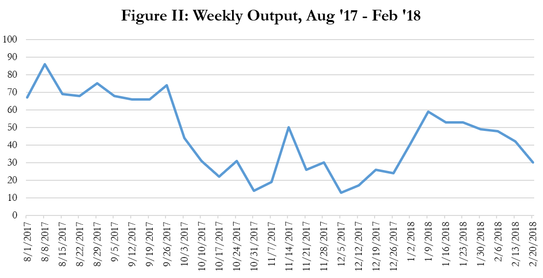 Considered in aggregate over the course of the last year, the data show that the Islamic State’s online productivity fell steadily by about five percent a month between February and September 2017 (see Figure I). From the end of September through December, though, the previously steady decline accelerated precipitously: By October, the group’s output levels had collapsed by more than 50 percent, falling by a further 17 percent in November, and 23 percent in December. In early 2018, it exhibited something of a recovery, with a 68 percent increase in productivity in the month of January that left its overall output not dissimilar to what it had been four months earlier. In February, though, online output once again dropped—albeit nowhere near as rapidly as had been the case in the fall and winter of 2017.