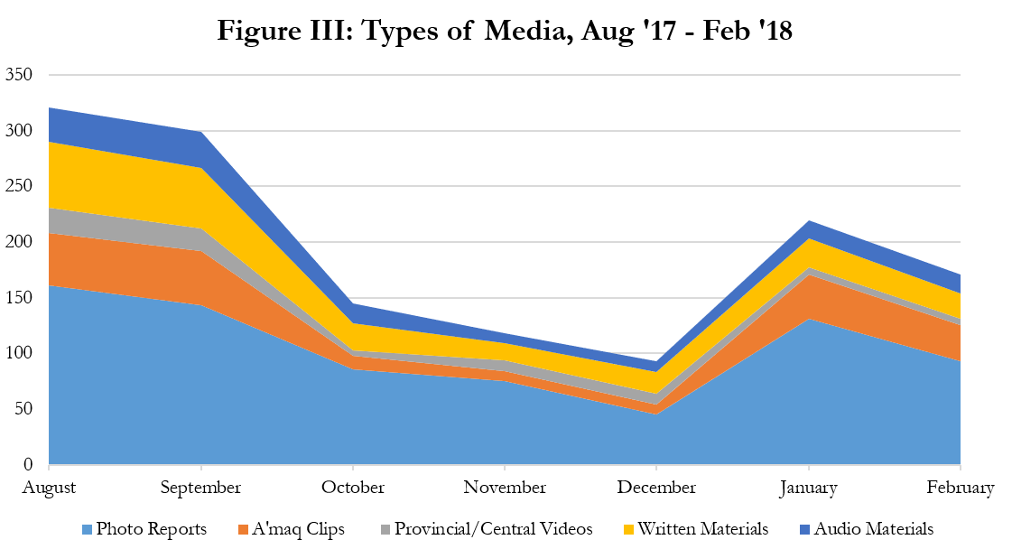Tracking the 2017 decline is no simple task. However, by examining ISIL’s output over the last year, paying special attention to the 1,373 unique media products that it published between Aug. 1, 2017, and Feb. 28, 2018, it is possible to reach some approximate conclusions about what has been happening in the organization’s media headquarters, and why.