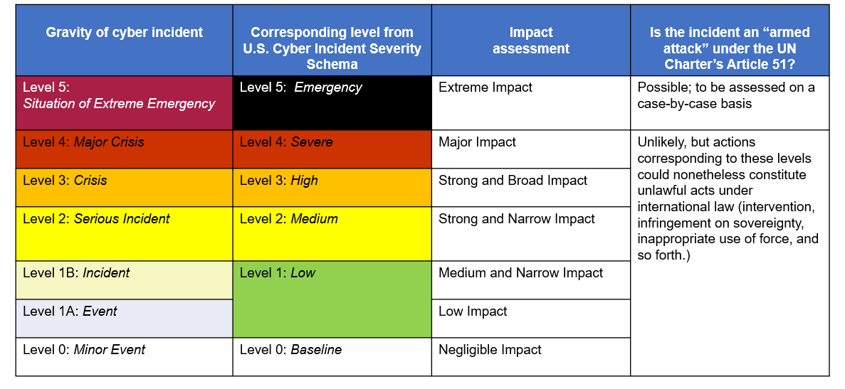 The review establishes cyber defense as a strategic priority, confirming that a conflict that starts in the cyber domain could have broader diplomatic, political and military consequences. It displays a five-grade scale of potential response to cyber incidents based on the U.S. Cyber Incident Severity Schema. Although less precise than its U.S. equivalent, the French chart signals that a predefined set of responses would be available to leadership in case of a crisis, across the spectrum of non-military and military capabilities.