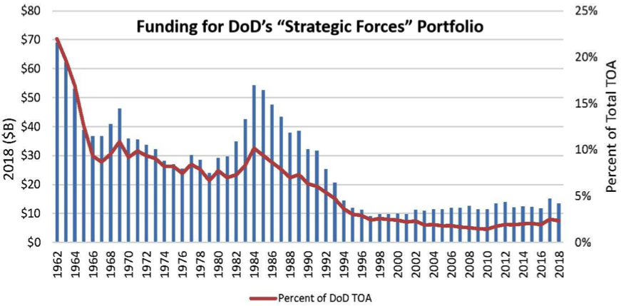 From 1964 until the end of the Cold War, this portfolio accounted for about 9.6 percent of the department’s annual Total Obligation Authority on average. This share has decreased to an average of about 2.4 percent since FY 1992, a level that was barely sufficient to upgrade and extend the operational lives of the aging triad.
