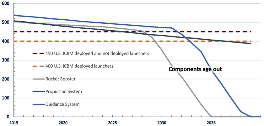 Currently, America’s operationally deployed ICBM force is made up entirely of 400 Minuteman III missiles, which were first fielded in the 1970s. Similar to the air-launched cruise missile, the Defense Department has said the Minuteman III will not meet its future requirements. Though a 2017 Congressional Budget Office report suggested that refurbishing the Minuteman III and delaying the proposed replacement program could reduce overall nuclear modernization costs, that report assumed the technical feasibility of continuing to extend the current missile’s service life and did not consider the aging out of Minuteman III’s component parts. Air Force and defense industry experts believe that further extending the service life of the Minuteman III’s solid rocket motors is not viable. Due to aging components that cannot be refurbished or replaced, the Minuteman III inventory may not be able to support a force of 400 operationally deployed missiles much past 2030.
