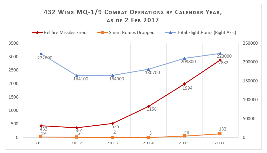 This is what professional teamwork that surpasses membership in a specific tactical community looks like: flying a third of the Air Force’s sorties across Central Command’s area of operations, Predators and Reapers accounted for about 7 percent of strikes in 2015 and 9 percent of strikes in 2016 — but even more frequently, they found enemies and “passed the ball” to teammates. According to Col. Cluff of the 432nd Wing, Predators and Reapers were involved in “pretty much every engagement.” In the cycle from discovery to destruction, they were part of the kill-chain for 50,301 out of 61,723 strikes. In other words, just over 81 percent of the time the U.S. Air Force attacked, its enemies had been under a Reaper’s crosshairs.