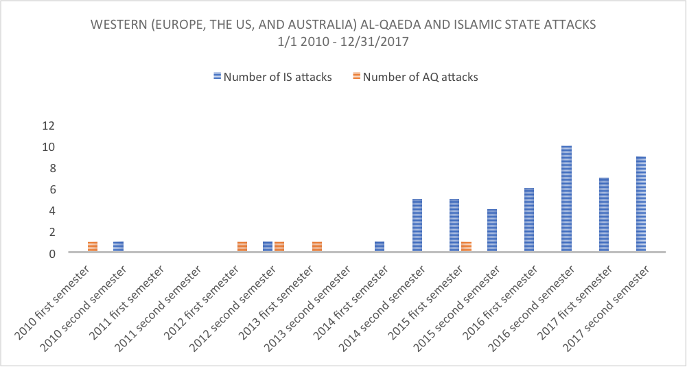 Before 2014, al-Qaeda was considered the primary jihadi threat against the United States and its Western allies, based on its history of organizing and supporting terrorist attacks in the West and its continuous rhetorical emphasis on these countries as its number one enemy (e.g. al-Qaeda leader al-Zawahiri’s most recent speech “America Is the First Enemy of the Muslims”). But in 2013, the Islamic State emerged in Syria and eventually began to challenge al-Qaeda. The period between 2014 and 2016 saw a record number of jihadi plots in Europe, and in the West more broadly, but these were controlled, guided, or at least claimed almost exclusively by the Islamic State and not al-Qaeda. This came as something as a surprise because before 2014, the Islamic State’s predecessor organizations (al-Qaeda in Iraq, Islamic State in Iraq, and ISIS/ISIL) were known to have a national, or to some extent regional, geographical focus, prioritizing the local Shiite enemy over the more diffuse “far enemy.” In their speeches, the groups’ leaders usually identified the Iraqi government or local Shiite groups as the main enemy, and actions were directed against these actors. For instance, as Cole Bunzel has explained, in a 2007 speech the group’s former leader, Abu Umar al-Baghdadi, argued, “The rulers of Muslim lands are traitors, un-believers, sinners, liars, deceivers, and criminals,” while the following year he said similarly that “fighting them is of greater necessity than fighting the occupying crusader.”