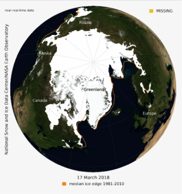 Arctic sea ice extent for March 17, 2018, was 5.59 million square miles. Orange line indicates 1981-2010 average extent on March 17. Credit: National Snow and Ice Data Center.