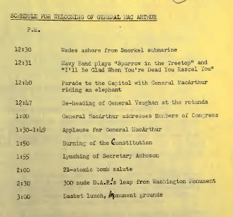 After Harry Truman fired Gen. Douglas McArthur in the midst of the Korean War in 1951, relations between the two men reached an entirely new level of hostility. The passage, written by one of Truman’s advisor in April 1951, is a satirical schedule of McArthur’s return from Korea. The document is contained in George Elsey’s papers. (Note: Gen. Harry H. Vaughan was a close advisor to Truman).
