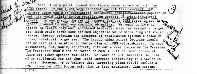 An indirect exchange of bureaucratic ire took place in the pages of the 1978 Nuclear Targeting Policy Review, a study from the Carter administration examining the capabilities the United States needed to deter a nuclear attack by the Soviet Union. The Review stated, “In any event, the set of targets for our ICBM force is not in itself planned to meet any specific objective.” In the margin, another official wrote, “Amazing! Then they won’t be missed.” This sardonic comment on the utility these ICBMs captures the political battles over disarmament during the Carter administration. The document is available through the National Security Archive.