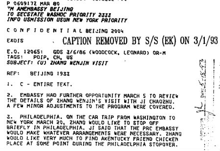 This March 1980 cable is from the Embassy in Beijing to Washington is about an upcoming visit by then-Deputy Foreign Minister Zhang Wenjin. Apparently, Zhang was to travel from Washington to New York City by car and had a specific culinary request. The document is available through the National Security Archive.