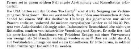 After the imposition of martial law in Poland in December 1981, the Reagan administration introduced a series of sanctions on the Soviet Union, much to the chagrin of Washington’s transatlantic partners. In this January 1982 meeting with Alexander Haig, Helmut Schmidt laments the U.S. propensity for sanctions, dating back to the Boston Tea Party. Schmidt’s arguments were two-fold (and strikingly familiar to present-day observers of international affairs): Europe was far more dependent on trade with the Soviet Union than the United States and would bear the brunt of the sanctions. To make matters worse, the Reagan administration had imposed these sanctions without consulting its NATO allies in advance. The parallels to the current administration’s approach are hard to miss and a reminder that anxieties about American unilateral action and a lack of consultation have long plagued transatlantic relations. The document is from Akten zur Auswärtigen Politik der Bundesrepublik Deutschland 1982.