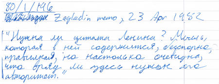 By the end of Leonid Brezhnev’s life, ideology in the Soviet Union seemed to be on the wane. A trenchant editorial suggestion by leading ideologue Vadim Zagladin about a speech being written for delivery at a Central Committee Plenum in the spring of 1982 hints at how pervasive this might have been even within the Kremlin itself. He asked, “Do we really need these quotes from Lenin?” The speeches of the era make clear that suggestions not to invoke Lenin’s authority are few and far between — references to him were virtually omnipresent. Zagladin’s suggestion to do less of this is a rare one, making his comment particularly unusual; but it is not out of step with some other officials’ remarks from the time about the cynical deployment of ideological tropes. This document is located in the Russian State Archive of Contemporary History. Photographs of documents are not permitted there, so this is a photograph of Simon’s notes from his visit to the archive.