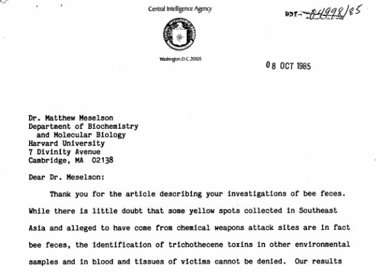 This letter was discovered during research into the “yellow rain” incidents, in which chemical weapons were used in Southeast Asian Communist countries. Deputy Director of Central Intelligence John McMahon writes, “Thank you for the article describing your investigation of bee feces.” This was a reply on October 8, 1985 to Dr. Matthew Meselson, who suggested the yellow rain was a natural phenomenon and that the toxins were related to bee feces. The document is located at the CIA’s Electronic Reading Room.