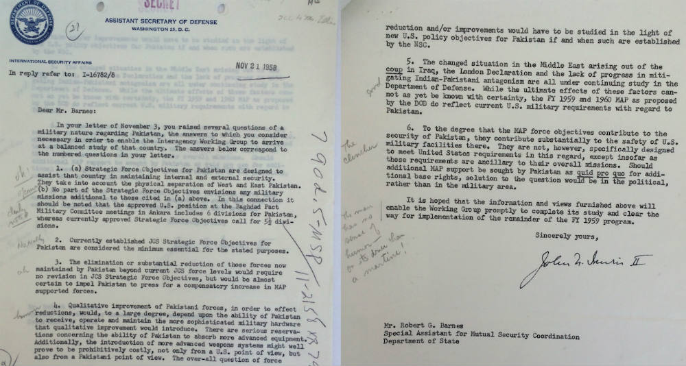 Robert Barnes, of the State Department, wrote this note in the margins of a letter he received from the Department of Defense. In an earlier letter, Barnes had asked Defense for information about the U.S. military assistance program for Pakistan. The response he received was dry, blunt, and not particularly helpful, explaining that aid to Pakistan was for political, rather than military reasons. This rationale didn’t come as a surprise to Barnes, whose sarcasm is reflected in the various notes he wrote in the margins, including “oh! of course” and “no, really.” Frustrated by the lack of active cooperation from the Department of Defense, he wrote a comment at the end of the letter capturing the general divide and tensions that existed between the Departments of Defense and State where military assistance was concerned: “This man has no sense of humor — or it’s drier than a martini.” The document is located at the U.S. National Archives.