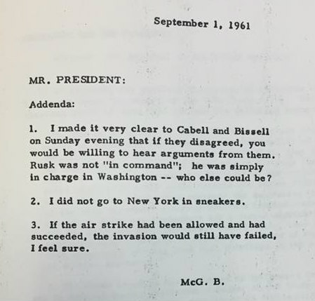 An amusing remark appeared as one of several addenda to a memo McGeorge Bundy wrote to President John F. Kennedy on September 1, 1961, a little less than five months after the Bay of Pigs invasion — a covert operation to overthrow Fidel Castro in Cuba — failed disastrously. “I did not go to New York in sneakers,” Bundy insisted, in between two more serious comments, one about who was “in command” at the time of the operation and another about his feeling that the venture still would have failed had Kennedy had not called off air strikes to assist the Cuban exiles at the last minute. The document is located at the John F. Kennedy Presidential Library.