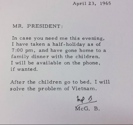 This is a letter from McGeorge Bundy to President Lyndon Johnson, written on April 23, 1965, less than two months after the start of what would become a three-year bombing campaign of North Vietnam and a significant escalation of American involvement in the Vietnam War. The document is located in the Lyndon B. Johnson Presidential Library.