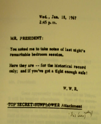 Walt W. Rostow, the National Security Advisor at the time, providing Lyndon Johnson with a summary of a top-secret conversation they had with Sens. Mansfield and Dirksen in the president’s bedroom on January 17, 1967. The purpose of the meeting was to discuss the possibility of negotiating an end to the Vietnam War through direct talks with Hanoi. Before telling them about the venture, Johnson swore both men to secrecy given the sensitive nature of the controversial negotiations. According to Rostow’s notes, “Senator Mansfield sat on a chair in the far corner of the room; Senator Dirksen sat on the President’s bed. The President was standing, in stocking feet, as he completed dressing for dinner.” The document is available through the Foreign Relations of the United States series.