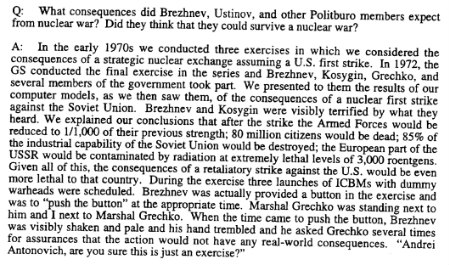 This anecdote is one of innumerable important insights from a series of interviews with Soviet generals and nuclear planners secretly conducted by the Department of Defense contractor BND Corporation at the end of the Cold War. This particular one was with Gen. Andrian A. Danilevich, a senior Soviet military officer. It shows that Leonid Brezhnev, the leader of America’s adversary, also had trepidation about destroying the world — and apprehension that he could begin a nuclear war by accident (e.g. pressing a fake button). The text is available via the National Security Archive.