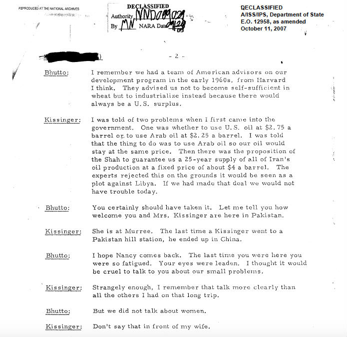 A conversation between Secretary of State Henry Kissinger and the Prime Minister of Pakistan Zulfikar Ali Bhutto on October 31, 1974. The discussion covered a variety of bilateral issues including Pakistan’s desire for conventional arms sales from the U.S. after India’s first nuclear test. In March 1975, the Ford administration lifted the arms embargo on Pakistan. The document is available through the Foreign Relations of the United States series.