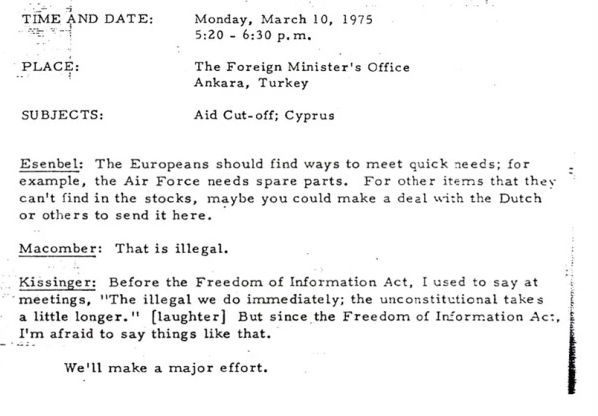 Kissinger was speaking to the Turkish foreign minister in March 1975 about the arms embargo the U.S. placed on Turkey after their invasion of Cyprus in 1974. The embargo was imposed by Congress despite objections from the Ford administration and Kissinger was looking for ways to help the Turks out. He clearly felt the Freedom of Information Act had cramped his style. The embargo was eventually lifted a little over three years later at the urging of Jimmy Carter. The document is available through the National Security Archive.