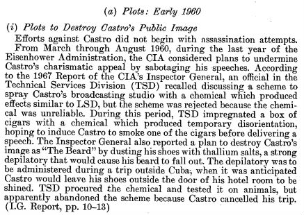 A ploy related to Fidel Castro’s beard was revealed in a report entitled “Alleged Assassination Plots Involving Foreign Leaders,” authored by the Senate’s Select Committee to Study Governmental Operations with Respect to Intelligence Activities — a.k.a. the Church Committee — on November 20, 1975. The Church Committee was created in early 1975 to investigate alleged abuses by the U.S. intelligence community. They issued their final report on April 29, 1976. These various reports are available through the Senate Select Committee on Intelligence’s website.