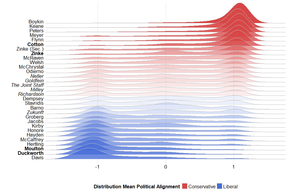 The data reflect ideology scores of the followers for military elite Twitter accounts with at least 1,000 followers, subsetted to those followers who tracked at least two American politicians. Ideology score provided by Adam Bonica’s CF dataset. Twitter follower data collected October–November 2017, with exception of Kirby (April 2018) and Peters (July 2018). Ideology score re-scaled to between -1.5 (most liberal) to 1.5 (most conservative) with height of the distribution re-scaled to represent min-max. Bold names indicate members of Congress whose principal prior career was in the military. The italicized names indicate active service chiefs.