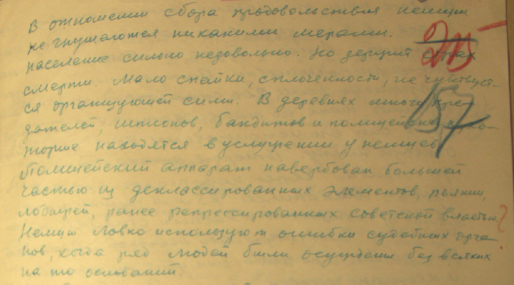 Transcript of a conversation with a Soviet partisan commander, October 1942. The interviewee speaks of the presence of collaborators in the villages. The final sentence, with a question mark scribbled in the margins, hints at the Great Terror of the 1930s: “The Germans adroitly exploit the mistakes of the judicial organs, [which they made] when a number of people were sentenced for no reason at all.” Source: TsGAIPD SPb (St. Petersburg Central State Archive for Historico-Political Records), 0-116/12/162, 5.