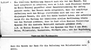 Internal report by a local Wirtschaftskommando (Economic Command), Opochka district, December 5, 1941. “As revealing of the attitude of the rural civilian population, one could mention the fact that in almost all localities, voluntary contributions to the German Wehrmacht were made. For instance, in Krasnoi, more than 6000 pieces of furs, felt boots, gloves, stockings, etc., were donated and explained as a sign of gratitude for the liberation from Bolshevism.” Source: Bundesarchiv-Militärarchiv, RW 31/900.