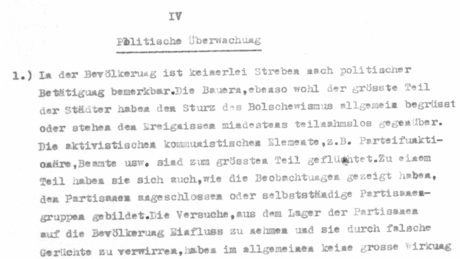 Internal report by the Wehrmacht’s 281st Security Division, December 1941. “The peasants, as well as most urban inhabitants, welcomed the downfall of Bolshevism […]” Source: Bundesarchiv-Militärarchiv, RH 26-281/25a.