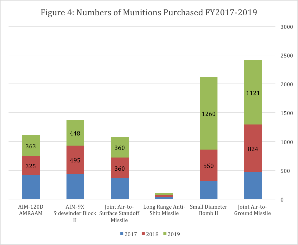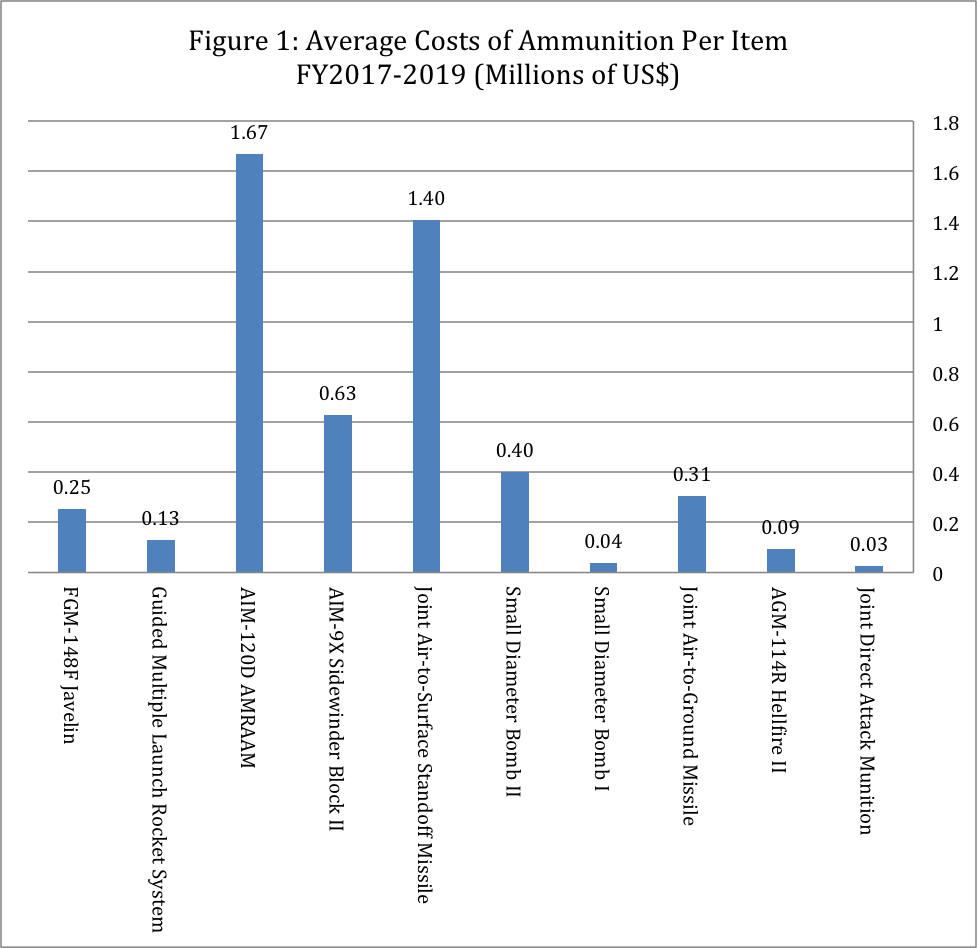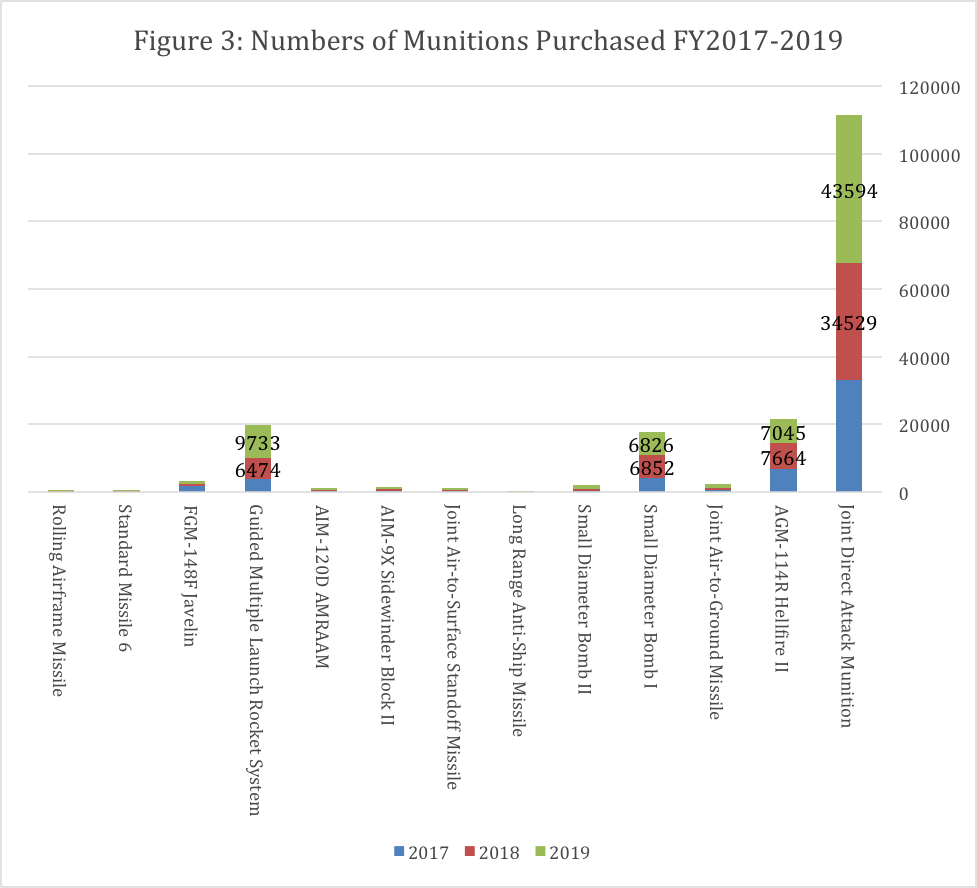 As can be seen in Figures 3 and 4 below, price has a direct correlation to the number of items purchased, with the numbers of simple and cheap JDAM being purchased in the tens of thousands, and more complex munitions being purchased in much lower numbers, down to the low hundreds. Furthermore, if we look at the absolute simplest munitions — such as M-795 high explosive 155 mm shells — we would see that each shell costs merely $1,375 and that in Fiscal Year 2019 the Army is on track to purchase 203,876 such shells.