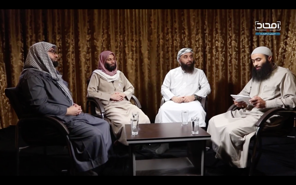 HTS’s roundtable, from left: Mudhar al-Weis, Abdurrahim Attoun, and Abu al-Fateh al-Farghali, along with an unidentified host.