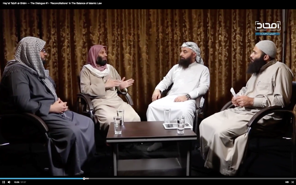 HTS’s video is billed as the first episode of the series “The Dialogue,” titled “‘Reconciliations’ in the Balance of Shari’a (Islamic law)”. HTS leaders Mudhar al-Weis, Abdurrahim Attoun (“Abu Abdullah al-Shami”) and Yehya al-Farghali (“Abu al-Fateh al-Farghali,” an Egyptian) recorded the roundtable as Syria’s northwest was bracing for attack. The video was released, apparently coincidentally, as Moscow and Ankara announced the Sochi deal.