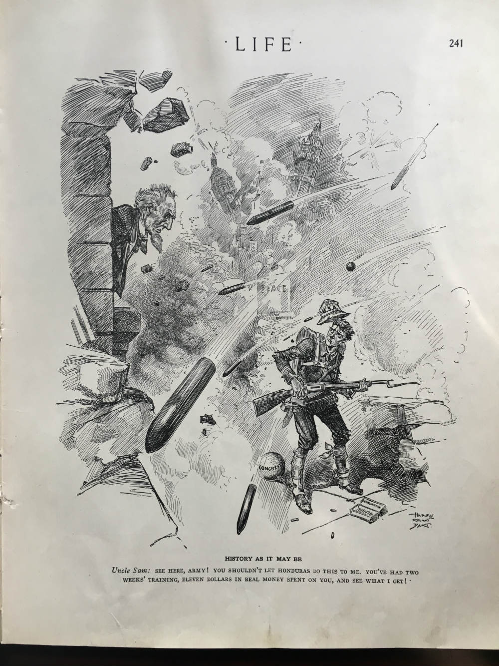 Theodore Roosevelt blasted the law, arguing that it was too little too late to prepare the nation for the coming war. A cartoon in Life magazine showed an American soldier running away from a battle with an iron ball labeled “Congress” tied to his feet. Uncle Sam yells at him “See here, Army! You shouldn’t let Honduras do this to me. You’ve had two weeks’ training, eleven dollars in real money spent on you, and see what I get!” An empty ammunition box sits broken on the ground, symbolic of Congressional parsimony. The Navy, as expected, did better, getting $315 million for new ships, well more than half of the bill’s total expenditures.