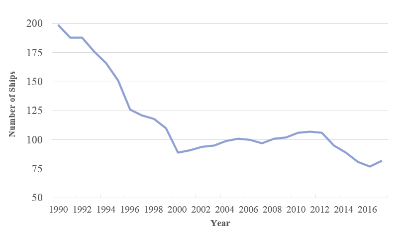 Figure 1: United States privately owned oceangoing self-propelled vessels 1,000 gross tons and above operating in international trades (1990 to Nov. 1, 2017)