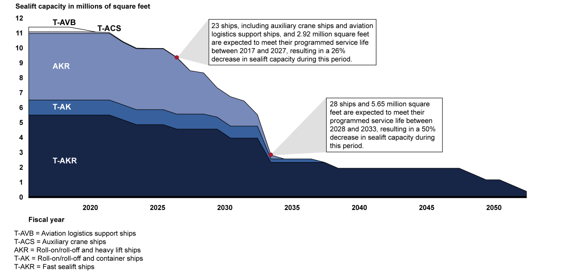 Figure 4: Projected surge sealift capacity decreases over time, based on programmed service life
