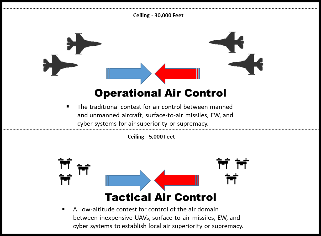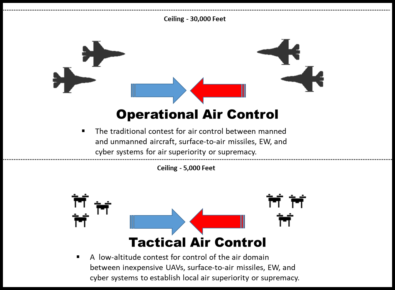 The U.S. Department of Defense has not defined these two levels of air control, but I propose these working definitions: Operational air control is a traditional competition between air-superiority fighters, air-defense systems, missile systems, and other platforms capable of influencing control of the skies at medium–high altitude. Tactical air control is a contest between less costly unmanned systems, short-