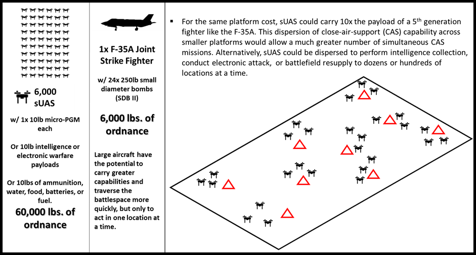 Small unmanned aerial systems will never rival the potential capabilities of a manned or larger unmanned aircraft. They cannot carry 500-pound MK82 bombs or transport infantry fighting vehicles like the M1126 Stryker, but they can readily drop 12-pound precision guided munitions, relay line-of-sight communications, or carry ammunition bundles to infantry companies in need. As their independence grows in parallel with enabling technologies, small unmanned aerial systems will gain the capacity to conduct many tactical airpower missions at low cost. Small unmanned aerial systems offer commanders an incredible option to divide and apportion airpower across their entire area of responsibility that manned aircraft cannot match. This is not necessarily swarming (a tactic), but a means of diffusing air-support capabilities to lower echelons.
