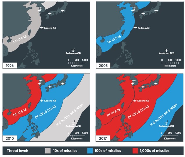 Figure 4. China’s land attack capacity growth between 1996 and 2017 (Source: Eric Heginbotham et al., The U.S.-China Military Scorecard: Forces, Geography, and the Evolving Balance of Power, 1996–2017, RR-393-AF, RAND Corporation, September 2015.)