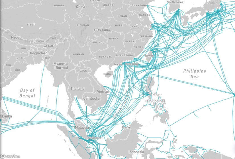 Figure 1. Undersea cable and ground-based landing station locations in the Indo-Pacific. American companies have invested billions of dollars on this infrastructure (Source, Infrapedia).